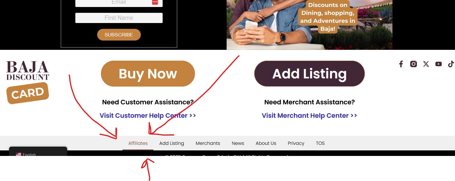 Scroll to the bottom of our website and look for the administrative links. Click on the "Affiliate" link.